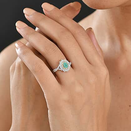 Bring charm to your jewellery collection with this ring that radiates vivid colour and standout charm. This striking design centres on a glowing emerald-toned stone, surrounded by a halo of yellow sapphires and moissanite that enhances its natural richness. The detailed halo and raised gallery create height and presence, while the rhodium overlay on 925 sterling silver adds a bright, polished backdrop that highlights every facet. The metal's hypoallergenic nature offers safety and comfort for sensitive skin. A beautifully crafted piece that brings colour, character, and a touch of drama to any fine jewellery selection.