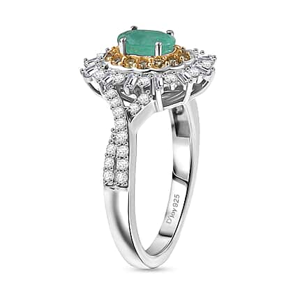 D'Joy Emerald, Yellow Sapphire & Moissanite Halo Ring in Rhodium Overlay Sterling Silver 1.02 Ct.