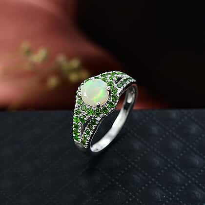 D'Joy Ethiopian Opal, Natural Chrome Diopside Main Stone With Side Stone Ring in Rhodium OverlaySterling Silver 1.175 Ct.