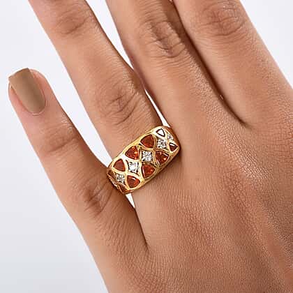D'joy Fire Opal, White Zircon Geometric Mosaic Ring in 18K Vermeil Yellow Gold Over Sterling Silver 1.51 Ct.