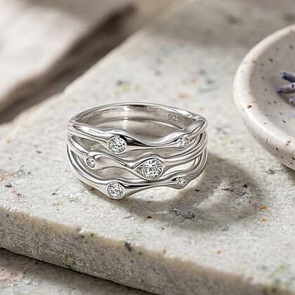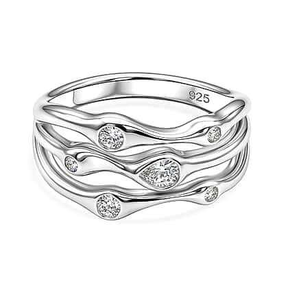 D'Joy GRA Certified Moissanite D-VVS1 Multi-Layer Wave Ring in Rhodium Overlay Sterling Silver