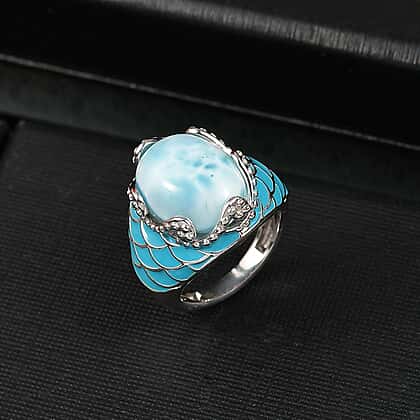 Djoy Larimar Solitaire Rolling Tides Ring in Rhodium Overlay Sterling Silver 11.02 Ct, Silver Wt. 6.29 Gms.