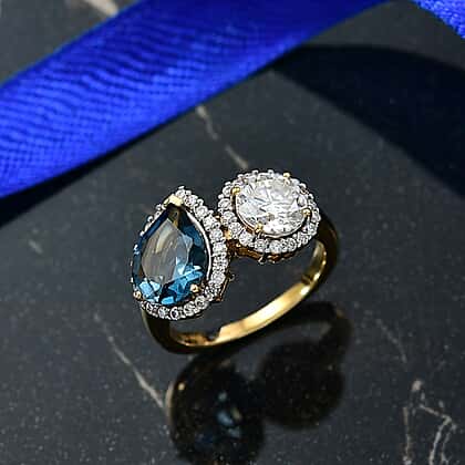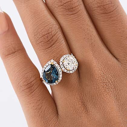D'Joy London Blue Topaz, Moissanite Fancy Ring in 18K YG VermeilSterling Silver 4.280 Ct.