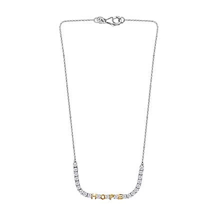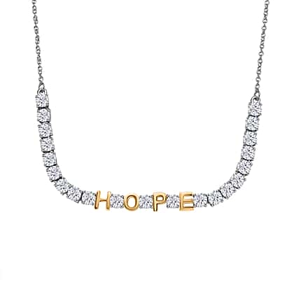 Exclusively designed for you with a graceful curve of dazzling moissanite, this D’joy moissanite necklace is a true reflection of modern beauty. Featuring letter HOPE lying at the heart of the piece in golden tone, adding a meaningful touch with a fusion of sentiment. This is not just an exquisite necklace, but a symbol of faith, trust, love, and belief. This masterpiece is adorned with sparkling moissanites stone creating a captivating design. Crafted in hypoallergenic 925 sterling silver, the necklace ensures comfort and enduring shine. Perfect for gifting or personal styling, this piece adds meaning to your gift, making it a treasure addition to your collection.