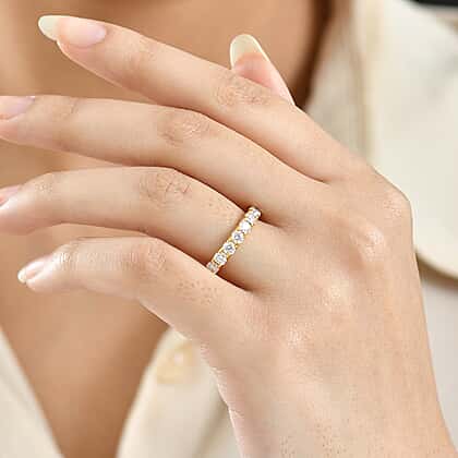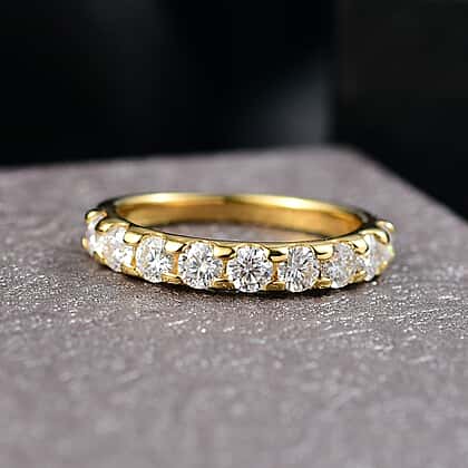 Step into the realm of brilliance with this ring, featuring a row of moissanite, known for its icy fire and brilliance, resembling natural diamonds. Meticulously crafted in 18K yellow gold-plated 925 sterling silver, this ring ensures durability and a warm, radiant shine. The ring's sparkling stones offer a captivating display of light and clarity. Perfect for stacking or wearing alone, this piece adds a touch of sophistication to your jewellery collection, making it an ideal choice for engagements or as a refined everyday accessory.