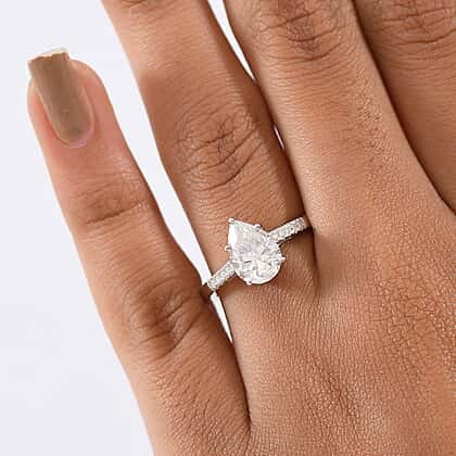 Inspired by the teardrops, this moissanite pear-cut ring pays tribute to human emotions. It can symbolise tears of joy and hence is associated with happy occasions such as engagements or weddings. This rhodium plated sterling silver ring features a pear-cut moissanite at centre, with a sleek band delicately set with round moissanites halfway. These tiny moissanites lend a sense of softness to the design, white centre stone helps to add a sense of individuality and uniqueness to the look. This pear-cut moissanite ring has an unmissable feminine allure and makes for a perfect pick to mark the journey of your love.