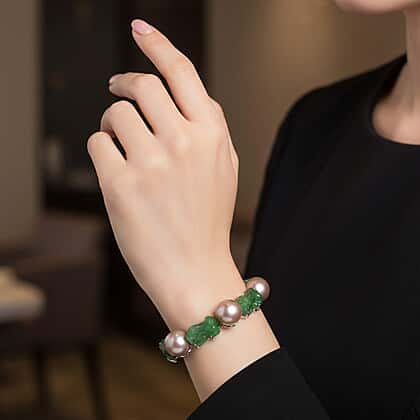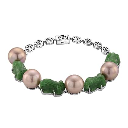 D'Joy Multi Color Edison Pearl Green Jade Pixiu Bracelet (Size - 7) in Rhodium Overlay Sterling Silver 86.00 Ct, Silver Wt. 9.35 Gms