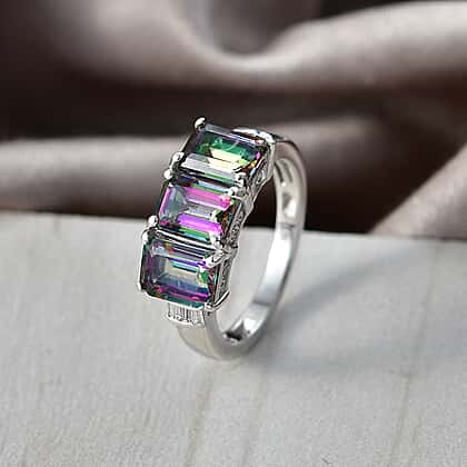 D'Joy Mystic Topaz & Natural White Diamond 3 Stone Ring in Rhodium Overlay Sterling Silver 3.50 Ct.