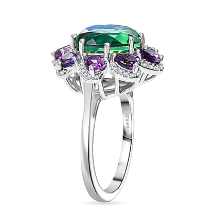 D'joy Peacock Triplet Quartz, White Zircon & African Amethyst Ring in Rhodium Overlay Sterling Silver 5.18 Ct.