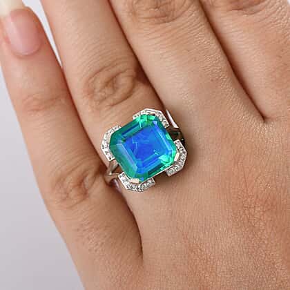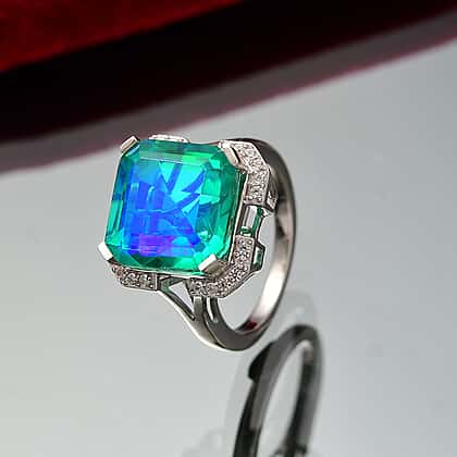 D'joy Peacock Triplet Quartz & White Zircon Ring in Rhodium Overlay Sterling Silver 8.73 Ct.