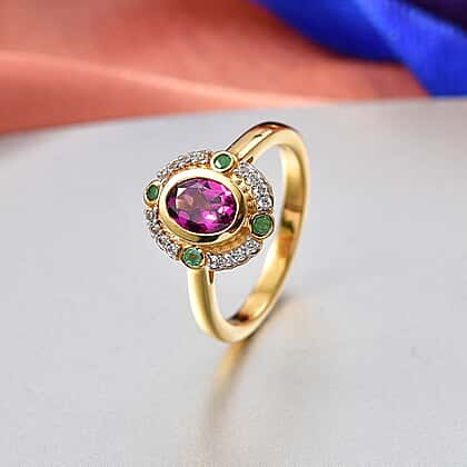 D'Joy Radiant Ember Garnet, White Zircon, Zambian Emerald Solitaire Ring in 18K YG VermeilSterling Silver 1.169 Ct.