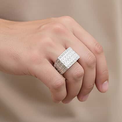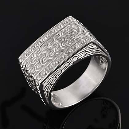 This rectangular signet ring offers a bold, structured look with intricate surface detailing and a smooth finish. The raised surface design adds depth, while the wide band provides a confident, well-defined profile on the hand. Crafted from solid 925 sterling silver, it offers durability and an enduring shine with a polished finish. Its hypoallergenic nature provides comfort and safety to sensitive skin. A strong and contemporary choice for anyone who appreciates a standout silverwork ring.