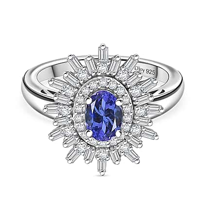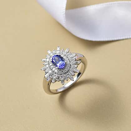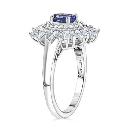 A celebration of brilliance and balance, this Tanzanite and moissanite ring feels like a floral dream. It features a vivid violet-blue tanzanite, known for its captivating depth and vivid hue. The oval-cut blue gemstone is encircled by a radiant halo of baguette and round-cut moissanites. Each facet catches the light like a burst of starlight, creating an irresistible play of fire and luxury.Crafted in a rhodium overlay sterling silver, it adds a mirror-like sheen to the design. This ring embodies modern opulence with a touch of cosmic beauty.
