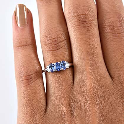 D'Joy Tanzanite & White Diamond 3 Stone Ring in Platinum Overlay Sterling Silver