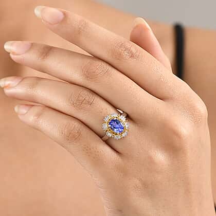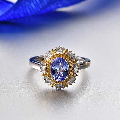 D'Joy Tanzanite, White Diamond & Yellow Diamond Ring in Rhodium Overlay Sterling Silver 1.75 Ct.