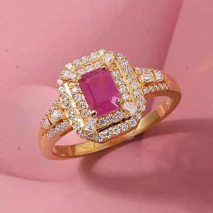 D'Joy Taveta Natural Ruby, Moissanite Halo Ring in 18K Vermeil Yellow Gold Plated Sterling Silver 2.04 Ct.