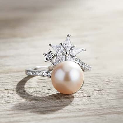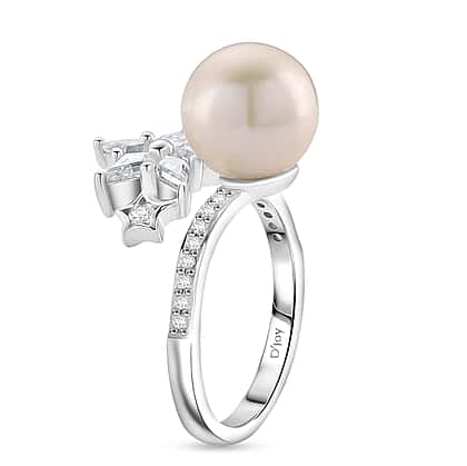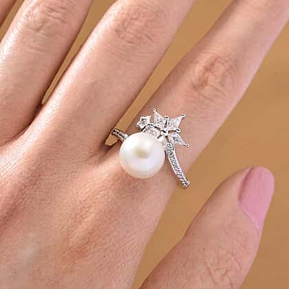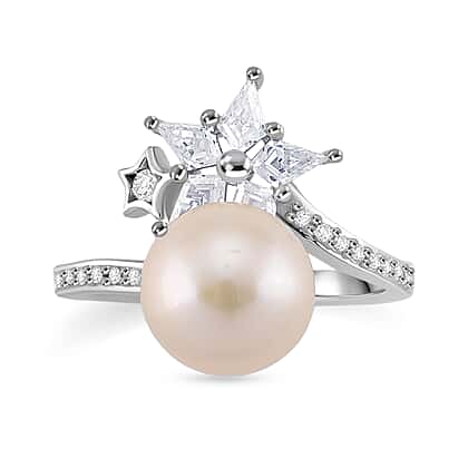 D'Joy White Edison Pearl, Moissanite & White Zircon Ring in Rhodium Overlay Sterling Silver 9.20 Ct.
