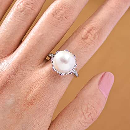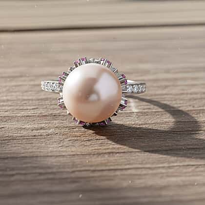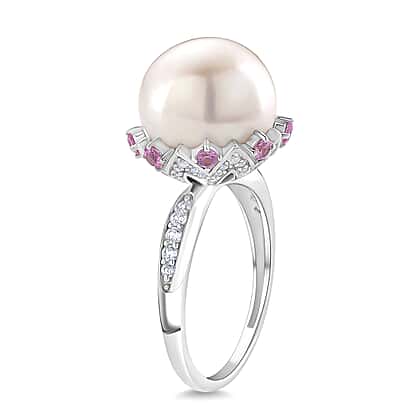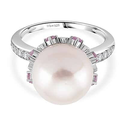 D'Joy White Edison Pearl, Pink Sapphire & White Zircon Ring in Rhodium Overlay Sterling Silver 0.99 Ct.