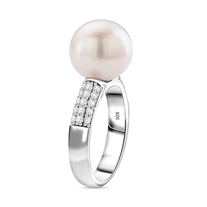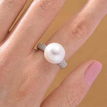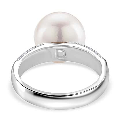 D'Joy White Edison Pearl & White Zircon Ring in Rhodium Overlay Sterling Silver 14 Ct.