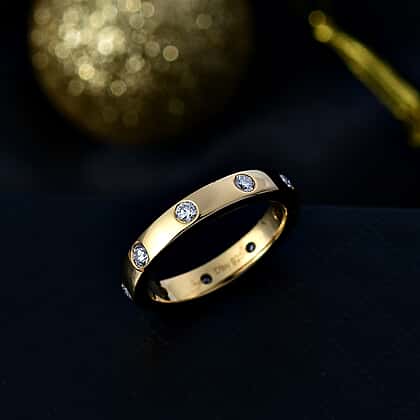 If you are wondering about versatility, stay rest assured because this D'Joy white moissanite band ring can be mixed and matched with ease. It boasts of a slim profile and is adorned with round moissanites placed evenly across the ring. These moissanites offer dimand-like sparkle to the design and looks captivating.The spacing here lets the smooth and glowy silhouette of the ring peep in and helps heighten the visual interest. It also lends a sense of clean look to the design which makes it even more desirable. Crafted in 18K yellow gold sterling silver, it means it has a thin layer of gold over the metallic base. This ring has a classic, minimal appeal and can serve as a foundation piece for your ring stack.