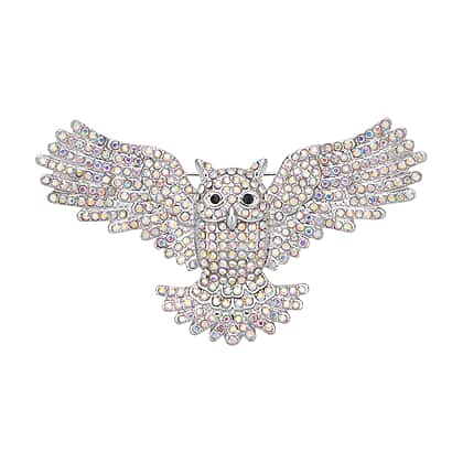 Simulated AB White Crystal and Black Austrian Crystal Owl Brooch or Pendant in Silver Tone