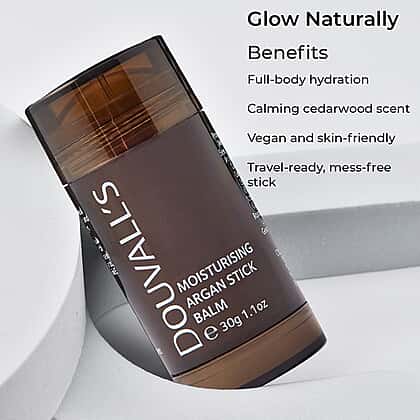 Nourish dry, tired skin with Douvalls Moisturising Argan Stick Balm in Hemp & Cedar. This 30g solid balm is rich in organic argan oil, hemp seed oil and soothing cedarwood to deeply moisturise and protect skin from head to toe. Its compact, mess-free twist-up stick design makes it easy to use on the go—perfect for lips, hands, elbows, and even cuticles. With a woody, calming scent and all-natural ingredients, it’s ideal for those who prefer minimal skincare with maximum results. A sustainable skincare must-have for your handbag, bedside, or travel pouch.