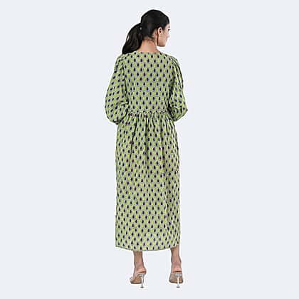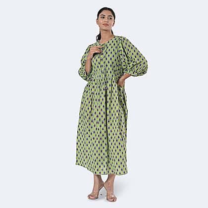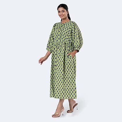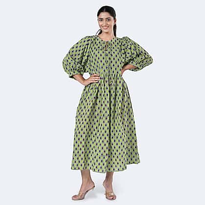 Add effortless elegance to your wardrobe with this La Marey hand block print cotton dress in a refreshing shade of green. Crafted from 100% breathable cotton, it features intricate hand block patterns that celebrate traditional artistry. The voluminous three-quarter puff sleeves and gathered waist create a graceful silhouette that flatters every figure. A round neckline with a delicate front tie detail enhances its feminine charm, while the 12.7 cm printed border along the hem and sleeve edges adds refined definition. Perfect for relaxed days or casual outings, this dress blends comfort, craftsmanship, and timeless appeal.