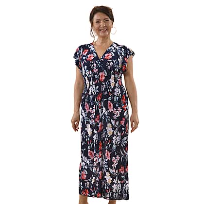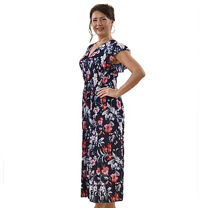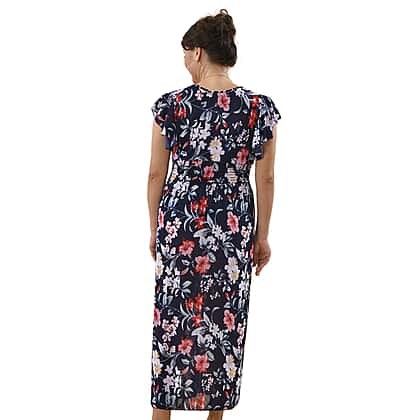 Tamsy Floral Pattern Smocked Waist Maxi with Flutter Sleeves - Navy & Red
