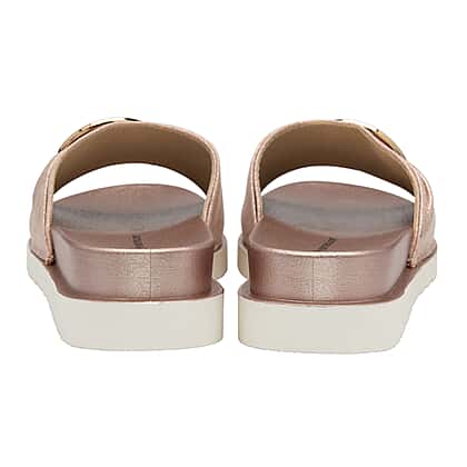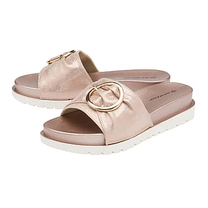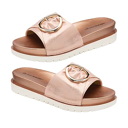 Add this summer trendy flip flop slip-on by Dunlop Paige and elevate your summer wardrobe collection. The women’s flip-flop features a textile belt on the top that has a golden colour metal buckle on it. It is lightweight, anti-skid, anti-slip, and has moulded footbed for soft and comfortable wear. Glide on this simple and flexible flip-flop for all-day fun and comfort.