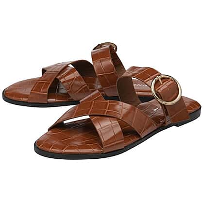 Step into comfort and effortless style with the Dunlop tan jade open toe sandals. Designed with crossover faux leather straps, these sandals feature a subtle mock-croc print that adds a touch of elegance. The polished gold-tone buckle enhances the look while ensuring an adjustable fit. The cushioned memory foam in-sock provides exceptional comfort, making them perfect for all-day wear. The flat sole ensures stability, while the open-toe design keeps your feet cool during warmer months. Whether for casual outings or holiday strolls, these versatile sandals are a must-have for your wardrobe.