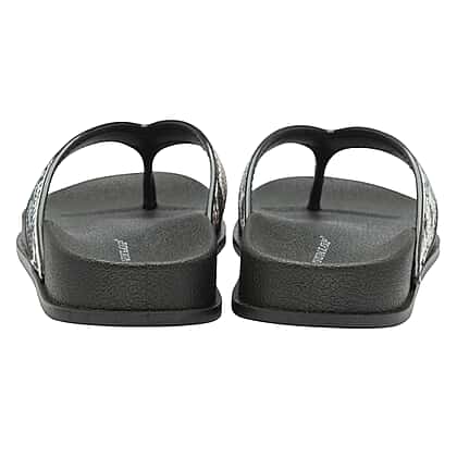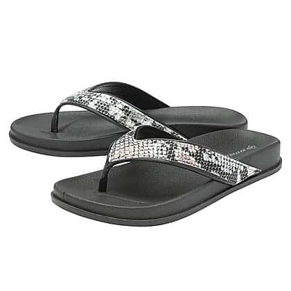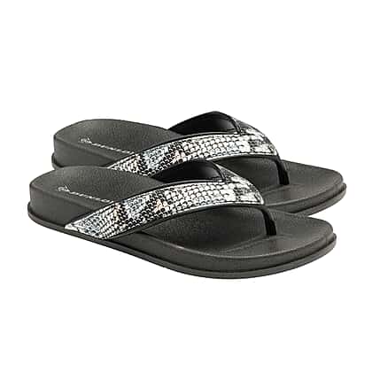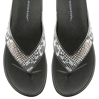 Give your feet a stylish makeover with the Dunlop Tyra Snake Print Flip Flop Sandals. The sandals are made in a faux-leather footbed that keeps it comfortable with a flexible and lightweight body. A snake print in silver gives it a chic finish. The soft sole is anti-slip and anti-skid that can be comfortably worn over long periods. Pair it with your favourite dress or denims to keep it cool yet classy.