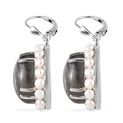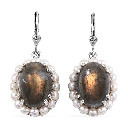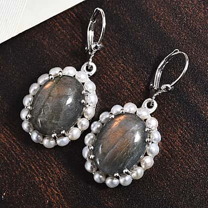 22.25 Ct Bokonaky Fire Labradorite and Freshwater Pearl Halo Drop Earrings in Platinum Plated Silver