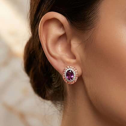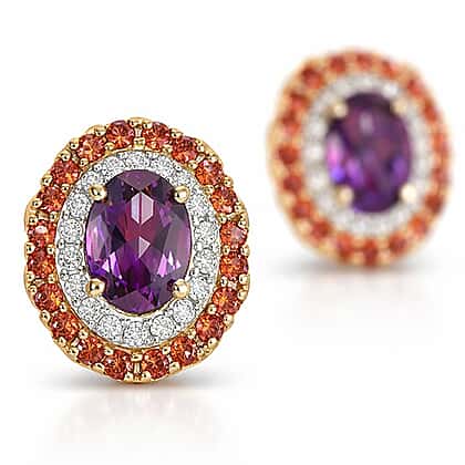 10K Yellow Gold AAA Purple Garnet, Padparadscha Sapphire, White Diamond Double Halo Push Post Earring 3.16 Ct.