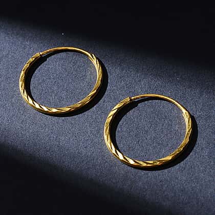 A set of textured hoops crafted in pure gold will leave you feeling pampered and beautiful. This pair of yellow gold hoop earrings has a textured theme made with diamond incisions. The leaves-like pattern offers a wonderful play of light. It is made of 24K yellow gold that leaves it draped in the imposing richness of a warm afterglow.