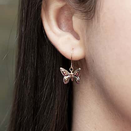 The dangling earrings are made in 9k rose gold and will make your ear look more attractive. These are embellished with a two-toned butterfly charm. These sterling silver earrings have a delicate and elegant design that is streamlined. These earrings are perfect for ease of usage because of their 0.5 weight. When worn, the earrings' hook clasp creates the appearance of an open hoop. The fish hook clasp makes the wearing method easy and quick. This clasp makes the butterfly a little moving with the flow of movement.