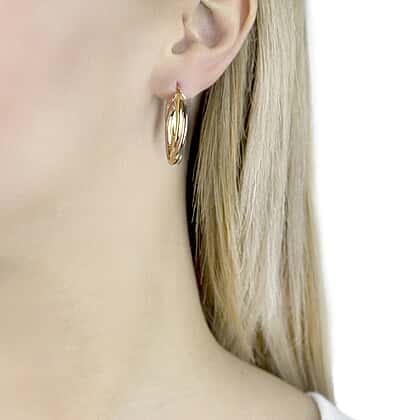 These twisted hoop earrings in Tri-Colour gold with an inconsistent thickness and elongated shape add a touch of style to your appearance. These earrings have a twisted textured pattern that makes them one-of-a-kind and beautiful. The easy-to-wear click-down clasp on these earrings makes wearing them a breeze. The metal weight of 4.2 grams demonstrates how light these earrings are.