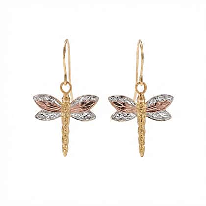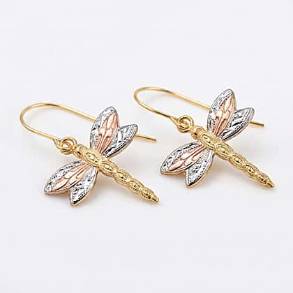 9K Tri Colour Gold 15MM X 17MM Textured Dragonfly Drop Earrings 0.45 grams