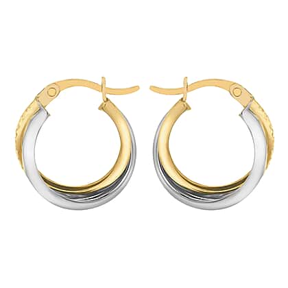 9K Two Colour Gold 15mm Diamond Cut And Plain 3mm Band Crossover Creole Earrings