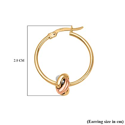 The glory of these 9k rose, white and yellow gold earrings will be coveted by each onlooker and provide you with a subtle style to uplift your daily wear fashion. These earrings' simple yet elegant design will match each look for the day and give you a complimentary golden hue to flaunt. The hoop of these earrings is crafted in 9K yellow gold in a circular shape, exhibiting the royalty of your personality. The use of 9K white and 9K rose gold merges well with yellow and creates a knot-like ball in the centre of the hoop's boundary. The magical play of three-toned gold makes a luxurious look for you, pairable with formal and casual attires.