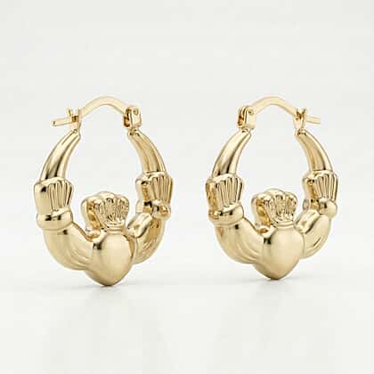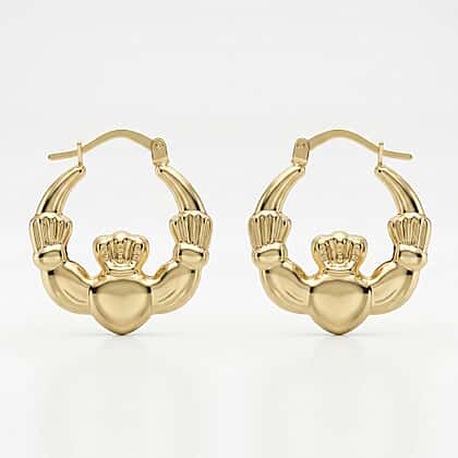 This alluring pair of Claddagh creole earrings is all you need to add that classy and chic look to your outfit. This earring features a hand that represents friendship, the heart symbolises love and the crown loyalty. This pair of earrings is made from 9K yellow gold and is secured using a hinge clasp fastening. Keep it simple and classy an ideal earring for your everyday wardrobe collection.