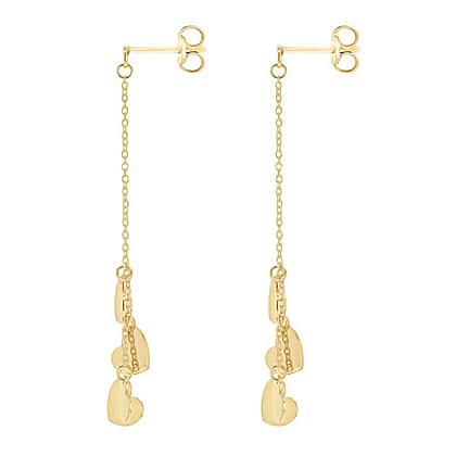 An endearing piece of jewellery that also makes the perfect romantic gift, these 9K yellow gold earrings feature miniature hearts of solid gold. The lightweight earrings that weigh just 1.400 grams can be worn with any outfit to add playfulness to your look. Each of the drop earrings measuring 6mm x 6mm features 3 little hearts.