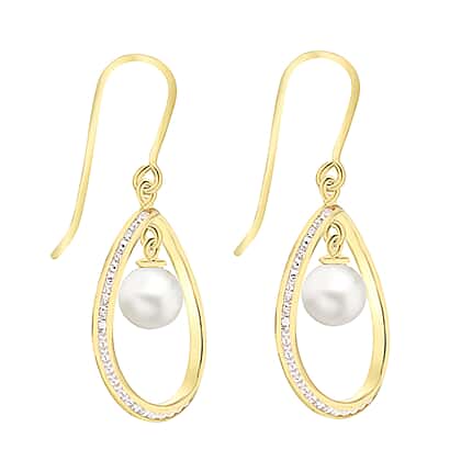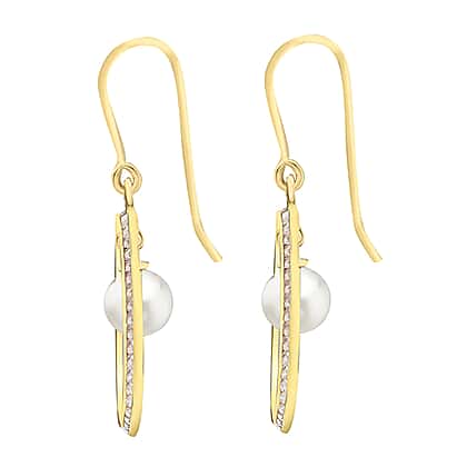 9K Yellow Gold 6mm Freshwater Pearl and Cubic Zirconia 15mm x 35mm Teardrop Earrings