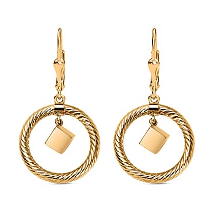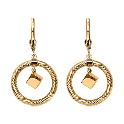 Add a touch of modern elegance to your look with these dangling cube earrings. Beautifully crafted, they feature a unique design where each earring showcases a small cube delicately suspended within a textured rope circle. These earrings are a testament to exquisite craftsmanship, secured comfortably with a lever-back setting. Made from luxurious 9K yellow gold, they effortlessly blend contemporary style with classic grace, making them versatile accessories for any occasion.