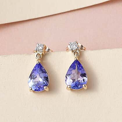 9K Yellow Gold Tanzanite and White Diamond (I4-GH) Dangle Earrings 1.29 Ct.