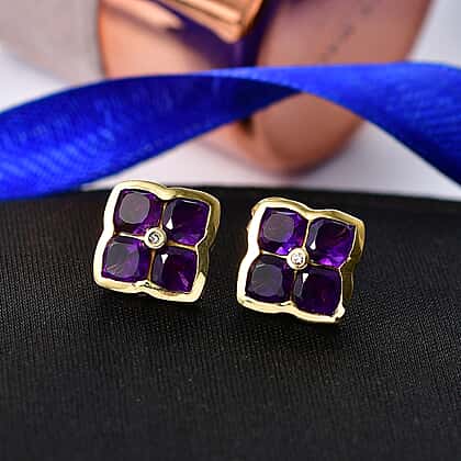Brighten your look with rich violet sparkle and modern floral charm with these amethyst stud earrings. Crafted in yellow gold plating on 925 sterling silver, these eye-catching studs feature AAA African amethysts arranged in a soft floral-inspired design. The deep purple tones create striking colour impact, while Luxuriant SI-G-H lab grown diamond accents add refined brilliance at the centre. The polished gold finish enhances the vibrancy of the gemstones, offering warm contrast and a contemporary feel. Designed with secure push back fastenings, these earrings combine bold colour, structured symmetry, and comfortable everyday wear.