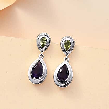 AAA African Amethyst & Peridot Dangling Earring in Rhodium Overlay Sterling Silver 2.07 Ct.