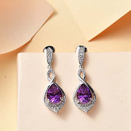 A modern take on timeless beauty, these infinity-inspired dangling earrings combine the rich purple allure of African amethyst with the brilliance of white zircon accents. Each earring features a 9x7 mm pear-shaped amethyst with a stunning concave cut, elegantly suspended within a sleek infinity motif. The rhodium overlay sterling silver ensures lasting shine, while the secure push-post design offers comfortable wear.