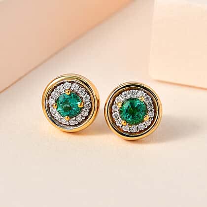 Unearth elegance with our AAA certified Emerald and Moissanite Earrings. Made in sterling silver and lavishly bathed in 18K Yellow Gold Vermeil, these earrings are a symbol of sophistication. Each earring features a captivating emerald embraced by a sparkling halo of 28 moissanites. These stud earrings radiate nature's lush green hues and luxury, making them the ultimate accessory for the modern, style-conscious woman.