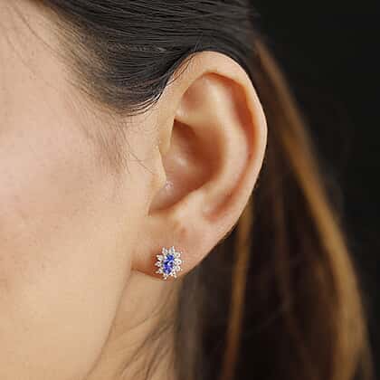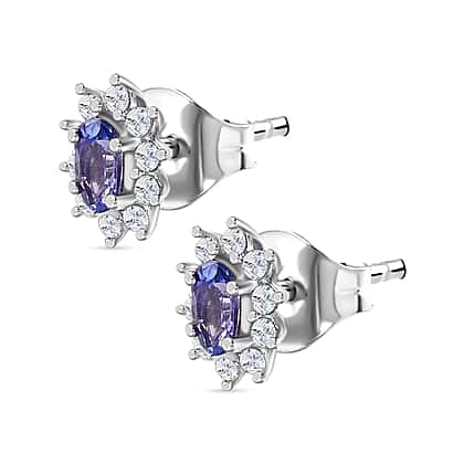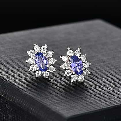 AAA Tanzanite & White Zircon Solitaire Stud With Push Back Earring in Rhodium Overlay Sterling Silver