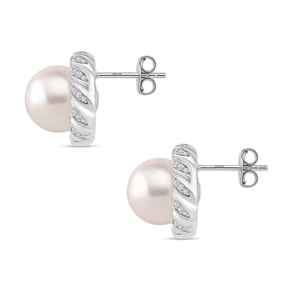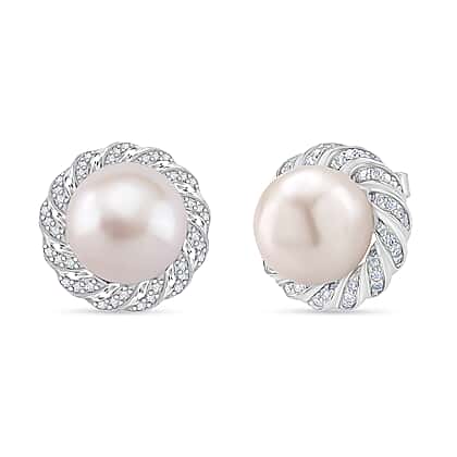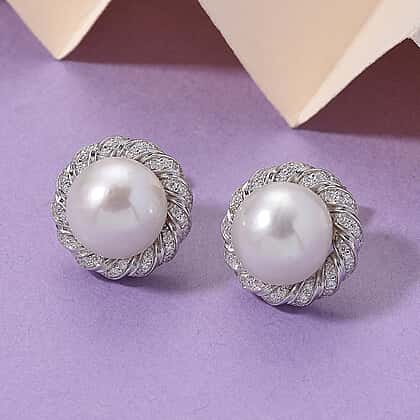 AAA White Edison Pearl (10-11MM) & Moissanite Solitaire Stud Push Back Earring in Rhodium Overlay Sterling Silver 15.57 Ct.